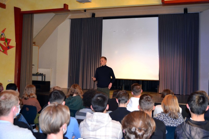 Somit wurde der Gruppenabend zu einem Obligo für die Klassen 8-12 umformatiert und die Marienauer*innen nutzen die Gelegenheit, ihre Fragen zu stellen. Es gab natürlich auch thematische Fragen, z.B. zur Atomkraft, zum Bildungswesen, zur Energiewende. Im Fokus des Interesses standen aber persönliche Fragen an ihn. Die Schüler*innen bewegte vor allem, wie er in die Politik kam, ob sein Alter eine förderliche oder hinderliche Rolle spiele, ob es möglich ist, noch Treffen mit Freund*innen zu haben u.v.m. Aus der medialen Berichterstattung ist bekannt, dass Politiker*innen, egal ob auf Kommunal- oder Bundesebene, oft verbalen Attacke durch Hass und Hetze ausgesetzt sind. So stellt sich die Frage, ob auch Jakob schon damit konfrontiert wurde. „Ja, leider kann ich diese Frage mit Ja beantworten. Meistens kommen solche Nachrichten per Email rein, im direkten Gespräch habe ich es noch nicht erlebt. Mein Team liest meine Emails, sie sortieren solche Nachrichten aus und geben mir dann eine Zusammenfassung. Da die Hassmails an mich persönlich gerichtet sind, habe ich die Erfahrung gemacht, dass es zu schmerzlich ist, sie wirklich alle selbst zu lesen. Das frisst mich auf. Wenn es wirklich heftige Post ist, bringe ich sie auch zur Anzeige. Inzwischen gibt es im Bundestag ein eigenes Polizeipräsidium, weil die Zahl der Anzeigen von Hass und Hetze von Abgeordneten so angestiegen ist“, so Jakob.