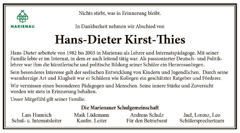 einem Menschen, der über zwei Jahrzehnte Marienau geprägt hat. Im Zeitraum von 1982 bis 2003 war Hans-Dieter Mitarbeiter der Schule Marienau. Hier wirkt er lange Jahre als Wohnbereichsbetreuer im Tobias-Haus (heute Knoop-Haus), später mit seiner Frau Heike im Waldhaus und auch als Tischgruppenbetreuer bei den Mahlzeiten. Schüler*innen in den Fächern Politik und Deutsch zu unterrichten, war ihm eine Herzensangelegenheit.