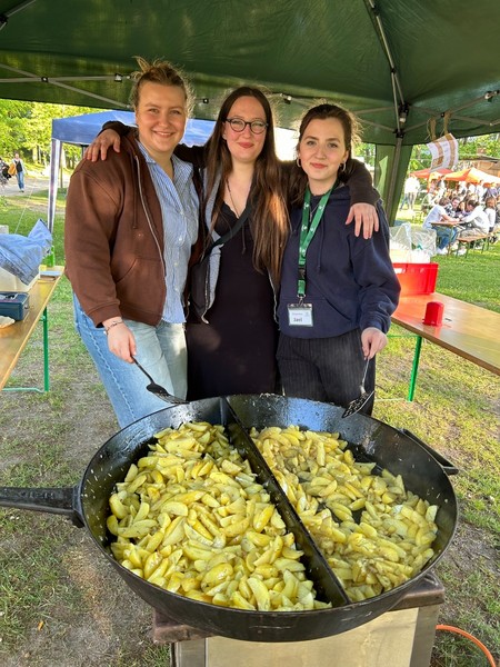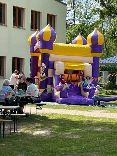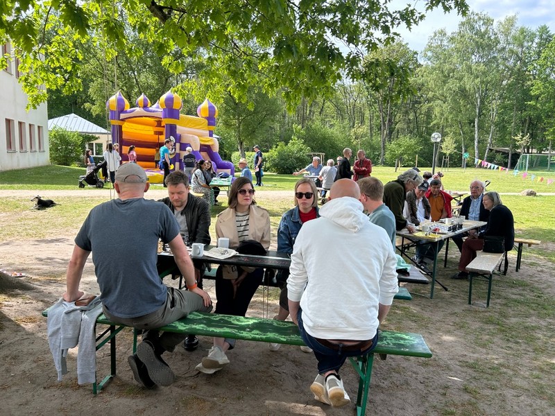 Am Himmelfahrtsmorgen trafen sich alle Marienauer*innen zum Brunch, es folgten Ponyreiten und der Dialog der Generationen. Der "Marienauer Shop" im BB1 freute sich über eine besonders gute Nachfrage. Wir freuen uns, wenn Hoodies, Sticker und mehr Marienauer Items in die Welt getragen werden. Das Kaffeetrinken fand erstmals zwischen Bärbel-Bohley-Haus und Erich Kästner Haus statt, was die Szenerie gut einrahmte und den Charme einer familiären Sommerparty ausstrahlte. Köstlicher Kuchen, eine Hüpfburg und die Gelegenheit, sich sportlich bei Fußball und Beachvolleyball auszutoben, rundeten das Fest ab. Schön war's, und wir freuen uns immer, Altmarienauer*innen hier bei uns zu begrüßen. Bis zum nächsten Mal!