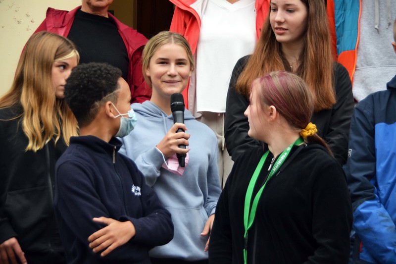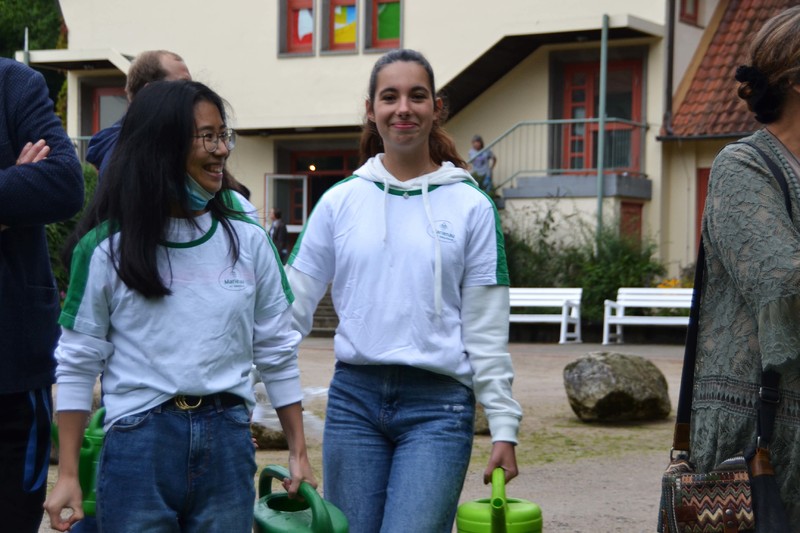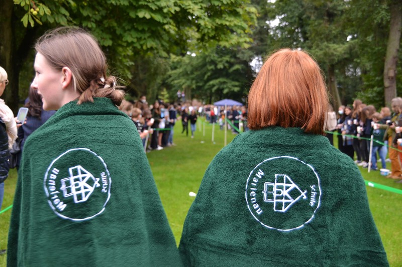 Normalerweise beginnt der erste Schultag mit einer gemeinsamen Begrüßung auf dem Haupthausplatz. Doch wie könnte es sein, die Hygienebestimmungen sorgten vorab für ein kurzes Zusammenkommen der Klassen, sozusagen ein „Meet & Test“, damit alle Schüler*innen und Lehrkräfte getestet in den Tag starten. Das wird in den ersten Schulwochen zur täglichen Routine gehören, so sieht es die Landesschulbehörde in Niedersachsen vor. Dann endlich werden allen neuen Marienauer Schüler*innen und Kolleg*innen auf der Treppe des Haupthauses begrüßt und vorgestellt. Und die Marienauer Tradition sieht im Anschluss auch die „Taufe“ der Neuen vor - dieser Tradition wollen wir trotz Pandemie nachkommen und verfahren ähnlich wie 2021: Wenn die Neuen nicht ins Marienauer Wasser kommen können, kommt das Wasser zu ihnen! Nach einem erfrischenden Lauf durch das Spalier warten die großen grünen Marienauer Handtücher, die von den Klassenlehrer*innen überreicht werden. Damit heißen wir alle neuen Schüler*innen und Kolleg*innen in unseren Reihen willkommen und hoffen, dass sie sich rasch zuhause fühlen an der Schule Marienau!