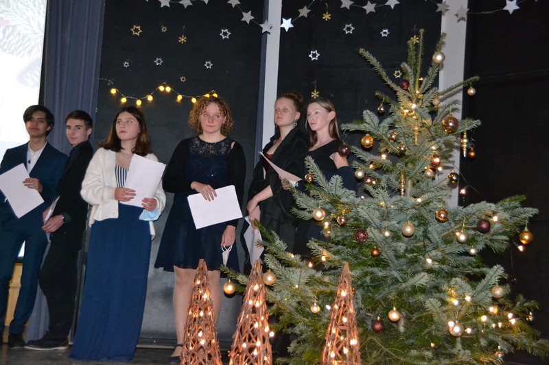 Der große Speisesaal ist geschmückt, fleißige Hände haben mit Bäumen, Kugeln und Lichterketten für atmosphärische Deko gesorgt. Die Küche arbeitet auf Hochtouren und zaubert ein leckeres Drei-Gänge-Menü und erfreut die Marienauer Schüler*innen und Mitarbeiter*innen. Caro, Anastasia und Henry eröffneten den Reigen der Festreden und sprachen als Schülersprecher*innen über das zurückliegende Jahr und das, was sie sich für das kommende wünschen: