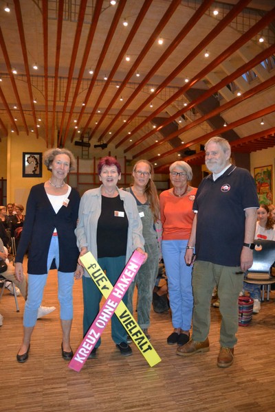 Aufgrund dieser Phänomene bildete sich die Gruppe beherzt. Ihr Anliegen ist, über diese rechte Szene im ländlichen Raum zu informieren und ein Zeichen für Toleranz und Vielfalt zu setzen. Das tun sie und inzwischen viele andere mit dem „Kreuz ohne Haken“, einem gelb-roten X aus Holz, das an vielen Höfen und Häusern zu sehen ist. „Wo dieses Zeichen zu sehen ist, macht es deutlich, dass hier kein Platz für rechte Gesinnung ist,“ so Martin Raabe.