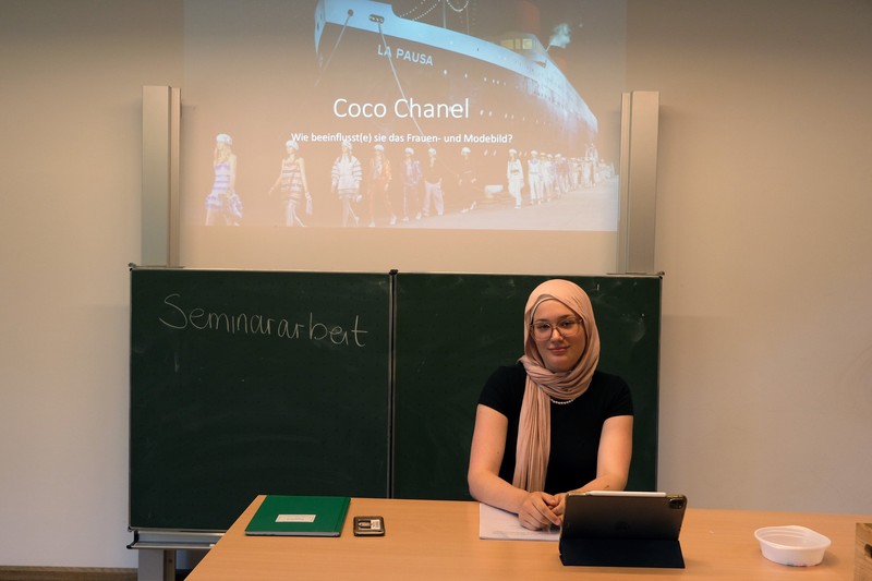 Das Seminarfach von Daniela Tautorus hatte das Semesterthema Feminismus in der Kunst, das Svenja Jaeger in ihrer Facharbeit aufgriff. Sie stellte die Frage, wie Coco Chanel das Frauen- und Modebild beeinflusst(e). Svenja arbeitete dazu literaturbasiert und so lautete auch ihr Tipp an ihr Publikum, frühzeitig mit der Recherche zu beginnen. „Es ist nicht notwendig, sich alle Bücher neu zu kaufen. Im Gegenteil, viele der Werke, die mir als Quellen dienten, habe ich in Bibliotheken ausgeliehen oder gebraucht gekauft. Viele gibt es auch gar nicht als Neuauflagen,“ so Svenja. Sie leitet ihren Vortrag ein mit einer Übersicht über die Struktur einer Facharbeit, sprach über die Bedeutsamkeit von Fußnoten und Quellenangaben. Inhaltlich gliederte sie ihre Facharbeit in die persönliche Geschichte von Coco Chanel, ergänzte es durch das Frauenbild in den verschiedenen zeitlichen Abschnitten z.B. während und nach dem 1. Weltkrieg und zeigte auf, wie sich dies in den Kreationen von Coco Chanel niederschlug: „Von Frauen für Frauen war eine Maxime von Coco Chanel. Sie ging davon aus, dass viele Frauen ihre Bedürfnisse und ihren Geschmack teilten. Einfachheit war ganz wichtig, schlichte Schnitte, die Eleganz und Funktionalität verbanden.“