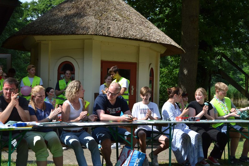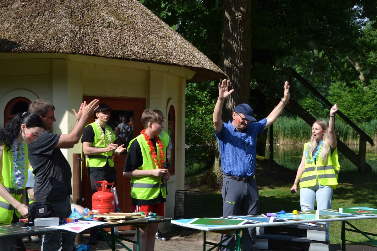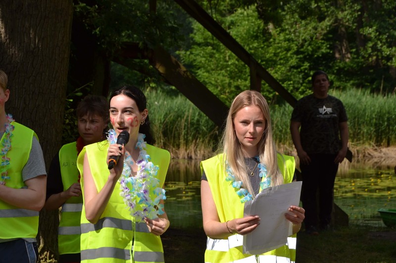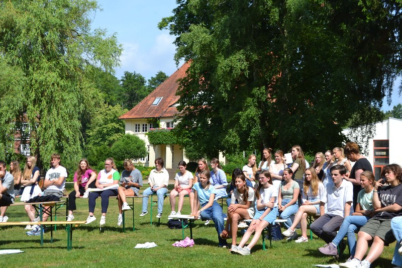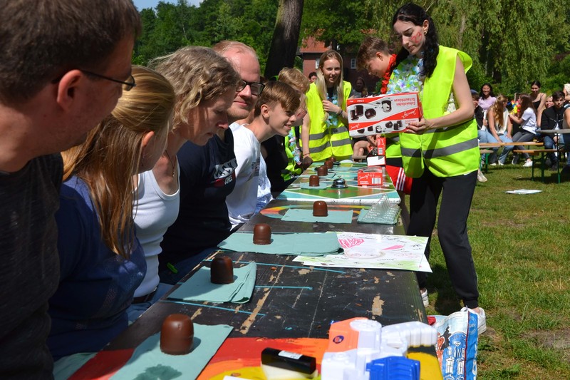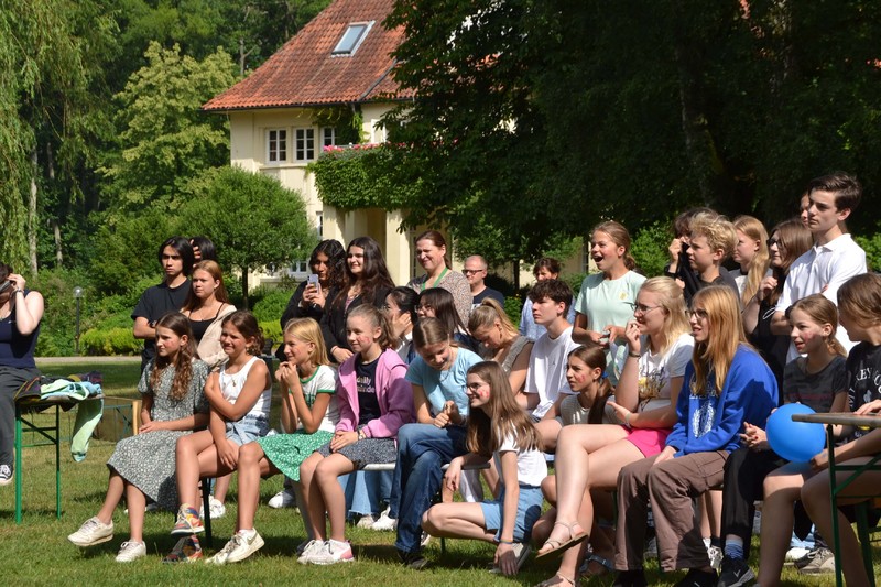 Der frühe Morgen begann mit der Herausforderung, zunächst den Weg ins Lehrerzimmer frei zu machen. Ein Zahlenschloss und viele mit Wasser gefüllte Becher waren dabei zu überwinden, denn die Zahlen waren auf der Unterseite einiger Becher geschrieben. Und dann war auch noch die Reihenfolge zu bestimmen, eine Aufgabe, der sich Matthias Ratzlaff und einige Kollegen in aller Frühe annahmen. Danach ging erst einmal alles seinen stundenplanmäßigen Gang. Nach dem Frühstück in der großen Pause, rief der Jahrgang alle Marienauer*innen am Teich zusammen, denn frisch gefrühstückt spielt es sich viel besser. Lilli, Evelyn und Lasse fungierten als Spielleiter*innen. Das Publikum wurde bestens unterhalten mit Helium-Karaoke durch Alexander Dölecke und Reimer Hinrich, sowie durch Quiz-Battles von Alja Koch und Lasse in Politik und Gert Erber mit Lukas in Geschichte. Gert Erber und Alexander Dölecke durften dann bei einer Art Poetry-Slam ihre Qualitäten im Reimen und Dichten unter Beweis stellen.