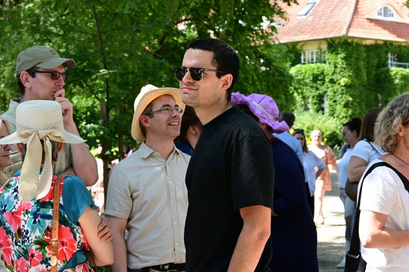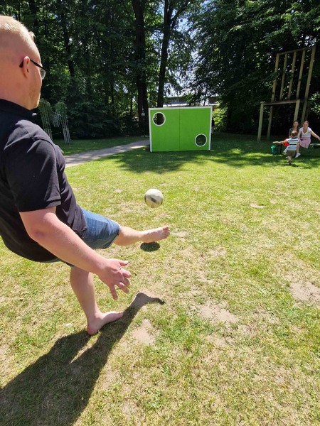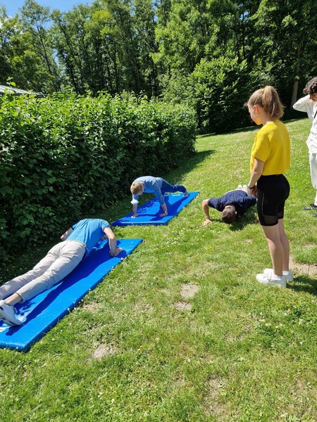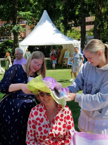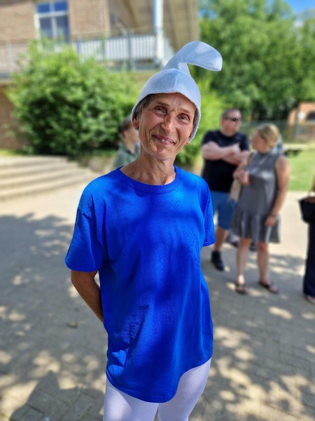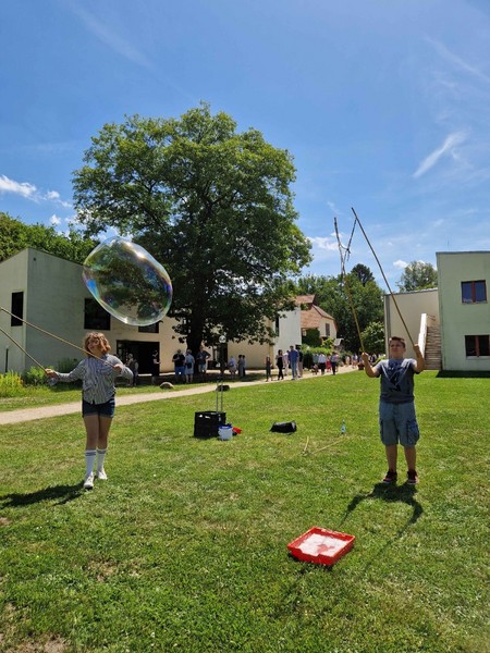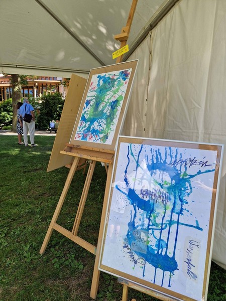 Auf dem Gelände warteten anschließend viele verschiedene Stationen zum Zuschauen oder gleich zum Mitmachen. Die Band „Missing Beatriz“ hatte ihren Premieren-Auftritt vor dem NWZ, auf dem alten Sportplatz präsentierten die Teilnehmenden der Trampolin-AG von Gaby Hinrichs als Schlümpfe, welche Sprünge und Choreographien sie im zurückliegenden Schuljahr erarbeitet haben. Schachspielen am Teich, Geschwindigkeitsmessen beim Tennisaufschlag, ein Quiz, Torwandschießen und viele Stationen mehr boten Möglichkeit, sich aktiv einzubringen. Die Kunst-Challenge-AG versteigerte Werke aus der Ausstellung „Neetzeln“, die wenige Tage zuvor in Dahlenburg stattgefunden hatte. Das Amphitheater hinter dem Haupthaus war für die 7. Klassen die „Lyrische Bühne“, dort trugen die Schüler*innen Gedichte aus dem vergangenen Unterrichtsjahr vor. Der Shanty Chor begeisterte nicht nur akustisch, sondern auch optisch mit neuen Shanty-Hoodies und brachte schließlich rund um das Mittagessen alle am Teich zusammen.
