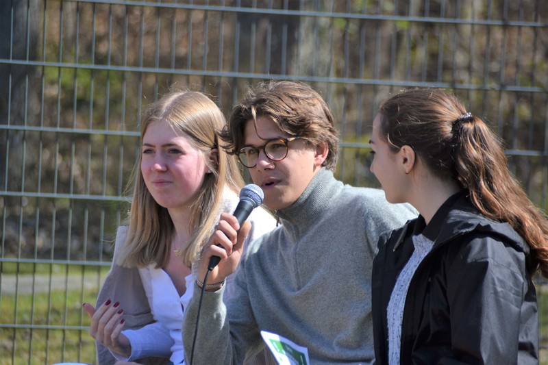 Auf dem Sportplatz markierten Pylonen die Bereiche, in denen sich die Klassen, also Kohorten hinsetzen konnten. Und obwohl die Veranstaltung unter freiem Himmel stattfand, trugen alle eine Mund-Nase-Maske zum gegenseitigen Schutz. Zur Wahl stehen zwei Teams. Team A bilden Anastasia, Caroline und Henry, Team B bilden Greta, Antonia und Yi.