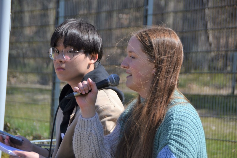 Vorab hatten die Kandidat*innen jeweils ein Video produziert, in dem sie sich persönlich und ihr Programm vorstellen. Auch wenn die Teams personell verschieden sind, gibt es doch bei den Anliegen, für die sie während ihrer Amtszeit eintreten wollen, Überschneidungen. Dies, so Greta, mache nur deutlich, wie wichtig allen diese Aspekte seien. Ihr Team hat mit Yi auch erstmals einen Vertreter aus den Reihen der internationalen Schüler*innen aus China aufgestellt. Das Team betonte, dass es neben den eigenen Ideen für sie vor allem darum gehe für die Anliegen der Schüler*innen einzutreten. Daher wollen sie nur einige Ideen als Anregungen geben und sich durch regelmäßige Kommunikation über itslearning auch Feedback und Aufträge aus den Reihen der Schulgemeinschaft einholen. Bei der Präsentation begeisterte Team A vor allem die Jüngeren mit zahlreichen Ideen zur Gestaltung des Geländes, um in den Pausen für noch mehr Bewegung zu sorgen. Auf der Agenda von Team A stehen u.a. auch die Neugestaltung der Hühnerkirche und die Idee, Wettbewerbe zwischen den Wohnbereichen zu initiieren.