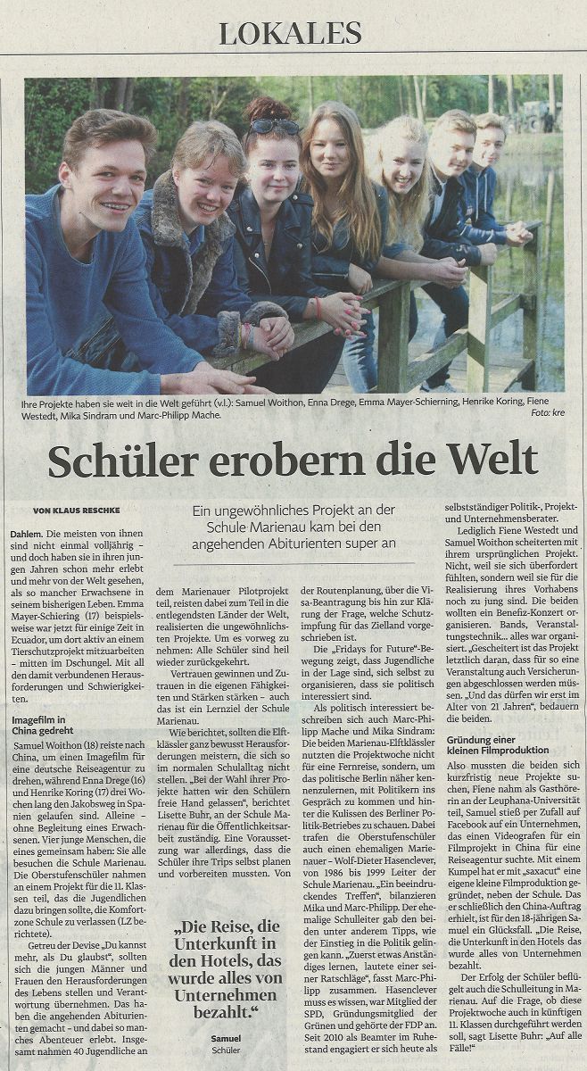 Im Frühjahr 2019 haben sich zum ersten Mal Schüler im Rahmen des Projekts auf den Weg gemacht: Mehrere nahmen es wörtlich und sind viele hundert Kilometer gewandert, z.B. auf dem Jakobsweg in Spanien oder dem Franziskusweg in Italien. Andere erkundeten ihr eignes Land unter einem festgelegten Thema. Das zentrale Element ist, dass sie Neues wagen, sich selbst fordern und sich etwas zutrauen. Dabei stehen ihnen die Marienauer Mitarbeiter zur Seite, um Hinweise zu geben oder Mut zu machen. Aber auch das ist schon Teil der Challenge, die Vorbereitung in Eigenregie zu bewältigen.